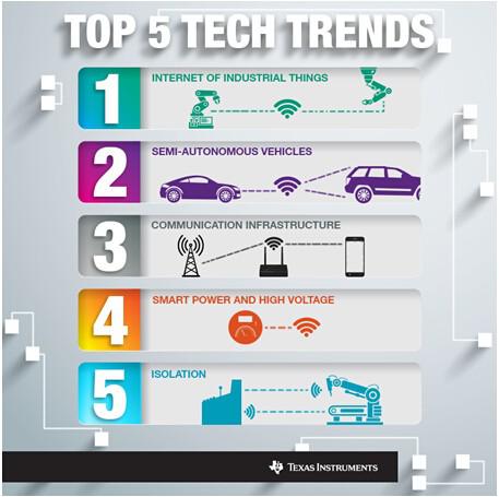 在迎接2015到來之際,我們有必要花時間來評估和預測未來的一年中將會出現的技術挑戰和突破創新。通過與眾多戰略客戶、大學合作伙伴以及TI產品線的技術專家進行探討后,我們認為TI將在一些重要技術趨勢中發揮戰略性作用。這些技術趨勢正推動著汽車和工業等多個市場的發展,而在此過程中,TI的工程師將幫助應對半導體技術領域的獨特挑戰,并利用先進技術改善我們的生活。